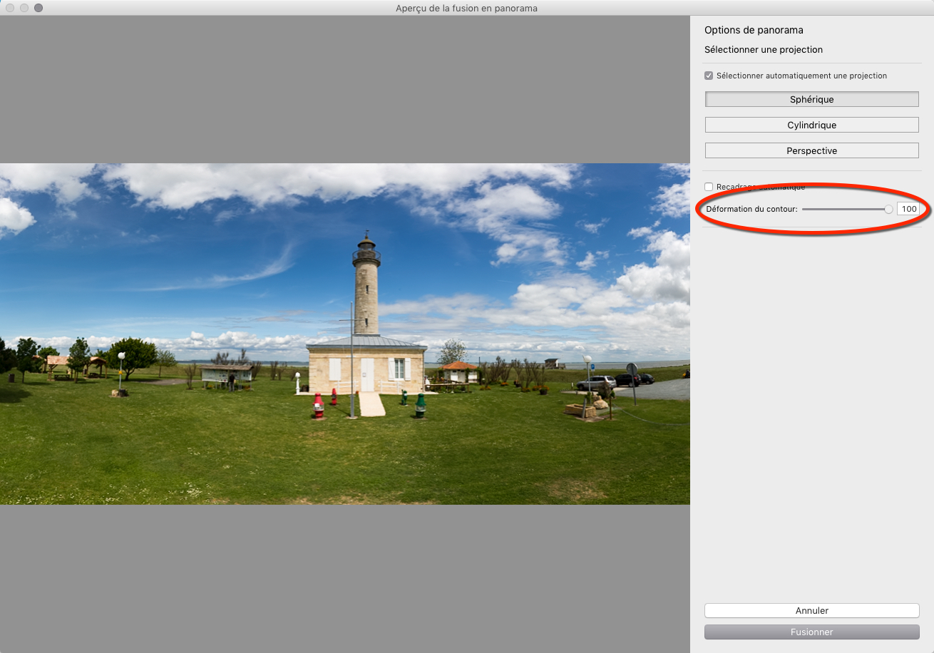 - Optimisation de la vitesse d’assemblage des panoramas, jusqu’à deux fois plus vite (attention, le curseur Déformation de contour augmente sensiblement les temps de calcul).