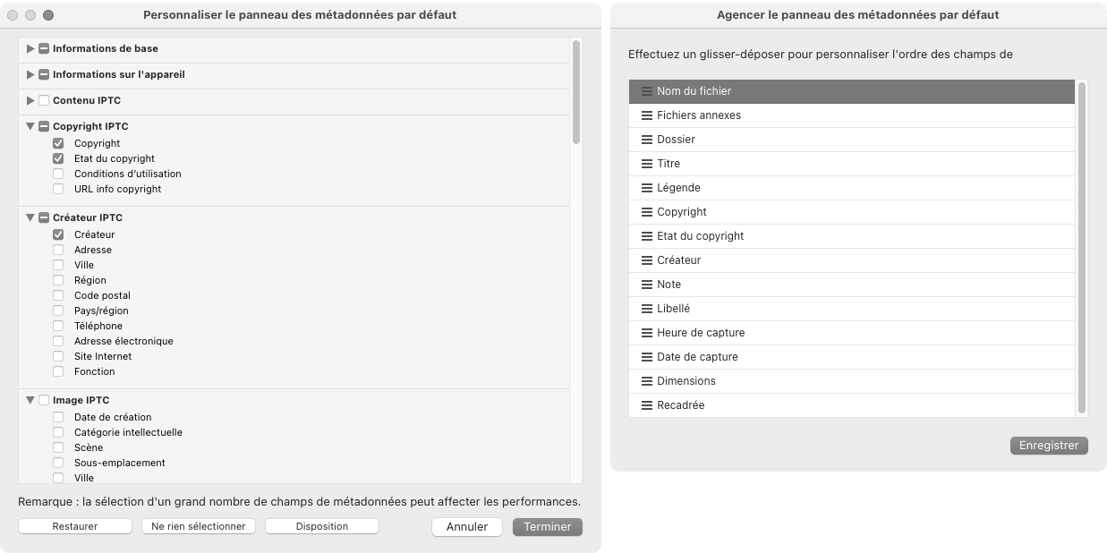 - En mode d’affichage Par défaut, vous pouvez personnaliser le contenu du panneau Métadonnées, en sélectionnant uniquement les informations que vous souhaitez y voir. Vous pouvez également changer l’ordre d’affichage des champs.
