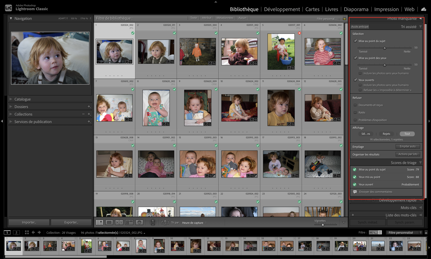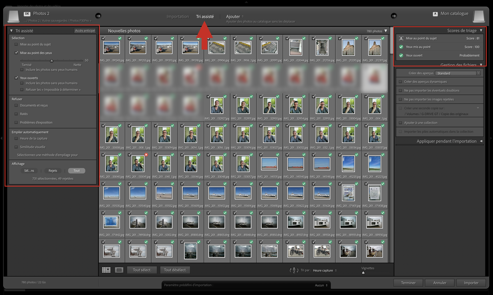 C’est la grosse nouveauté de cette fin d’année, le tri assisté, et il y a deux choses importantes à retenir : d’une part, il s’agit d’une première mouture, en « Accès anticipé », ce qui signifie qu’il s’agit d’un outil encore en phase expérimentale, qui a besoin d’être testé par la masse des utilisateurs et, d’autre part, elle s’adresse en priorité aux photographes portraitistes et d’évènementiel, les outils actuellement disponibles se focalisant sur la mise au point et les yeux des sujets. Bien entendu, certaines fonctions serviront à tous les autres, comme l’empilement automatique d’images similaires, mais photographes animaliers, de paysage et autres, il faudra encore attendre pour disposer d’outils dédiés à vos sujets de prédilection. Cerise sur le gâteau, dans Lightroom Classic, le tri assisté est également intégré au menu Importer ainsi que dans la prise de vue en mode connecté !