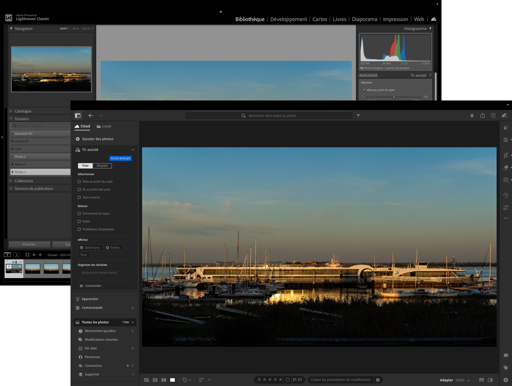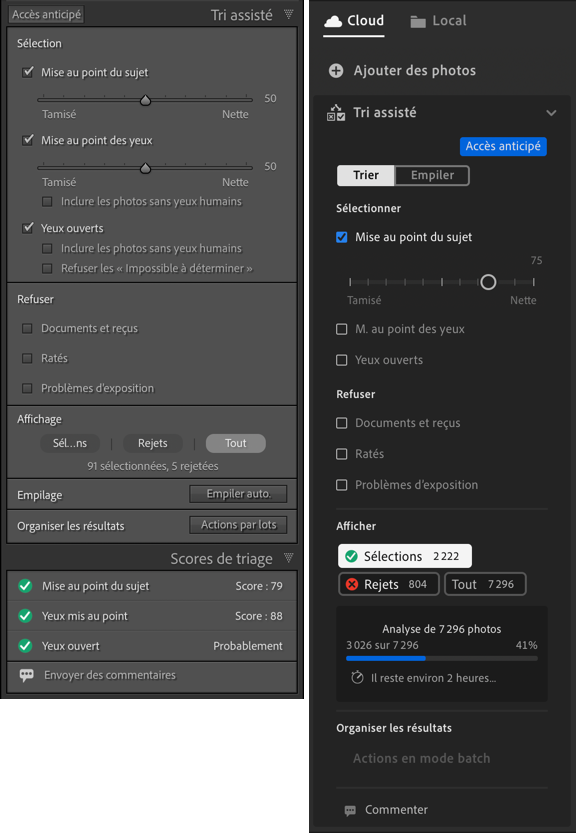 L’interface de tri assisté dans Lightroom Classic (à gauche) et Lightroom « cloud » (à droite).