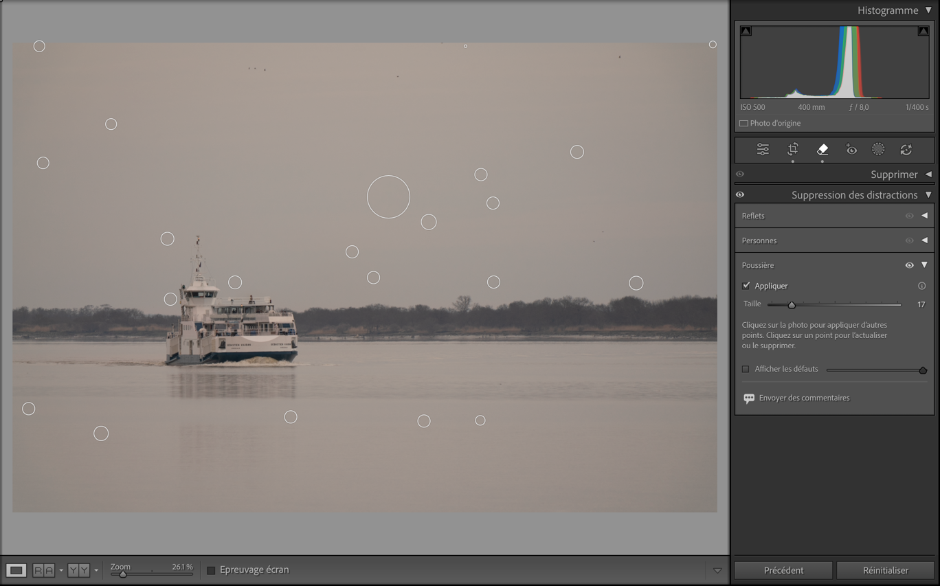 Détection et suppression automatique des poussières et taches de capteur (ici dans Lightroom Classic).
