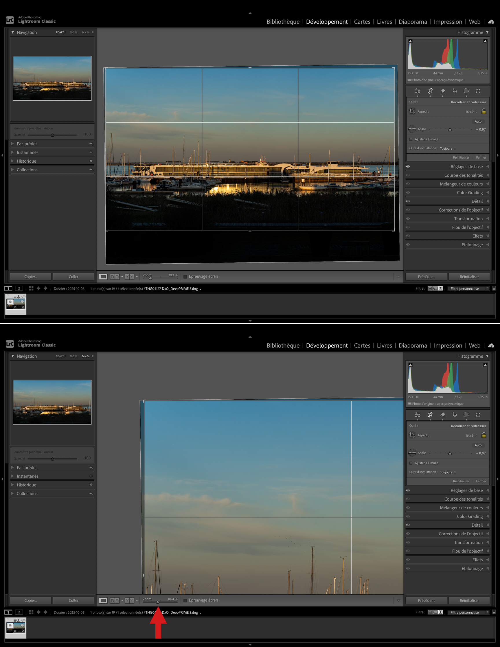 Zoomer dans l’outil Recadrer de Lightroom Classic. Pour vous déplacer dans l’image, pressez la barre Espace.