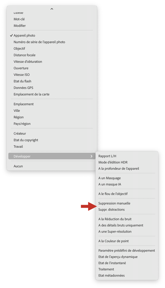 - Deux nouveaux critères ont été ajoutés au filtre de bibliothèque et aux collections dynamiques pour les images comportant la suppression manuelle d’éléments ou la suppression de distractions.