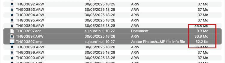Le fichier annexe .acr pèse 9 Mo, il contient les données relatives au masquage IA (ciel et sujet), au dépoussièrage automatique et au débruitage IA, le fichier annexe .xmp reste à 52 Ko, et contient les métadonnées et les corrections hors IA.