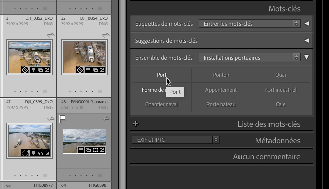 Pour attribuer un ou plusieurs mots-clés à une image ou un groupe d’images sélectionnées, la méthode la plus simple consiste à cliquer dans les cases correspondantes (Fig.02).