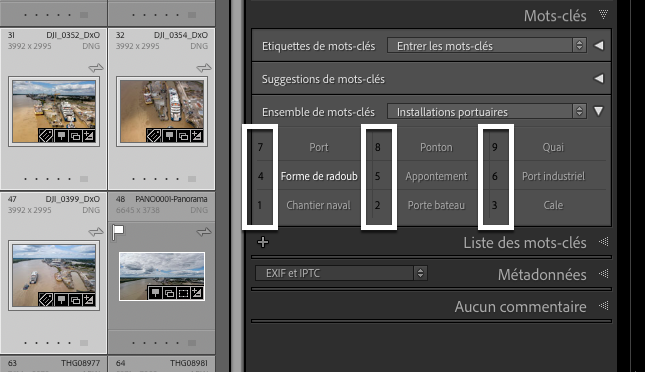 Les mots-clés représentent un travail fastidieux, mais Lightroom Classic est pourvu d’un grand nombre d’outils de saisie et d’attribution, auxquels s’ajoute une pipette qui vient en complément des ensembles de mots-clés. Ces derniers sont composés d’une grille de neuf mots-clés, vous avez la possibilité d’en créer autant que souhaité, et d’attribuer rapidement leur contenu aux images grâce au pavé numérique. Si cette méthode s’avère pratique, elle exige de travailler ensemble par ensemble, d’où l’intérêt de la pipette de mots-clés, qui permet de piocher plusieurs mots-clés dans plusieurs ensembles à la fois, puis de les attribuer d’un seul coup. C’est une petite gymnastique à laquelle il faudra vous habituer, en faisant quelques essais.